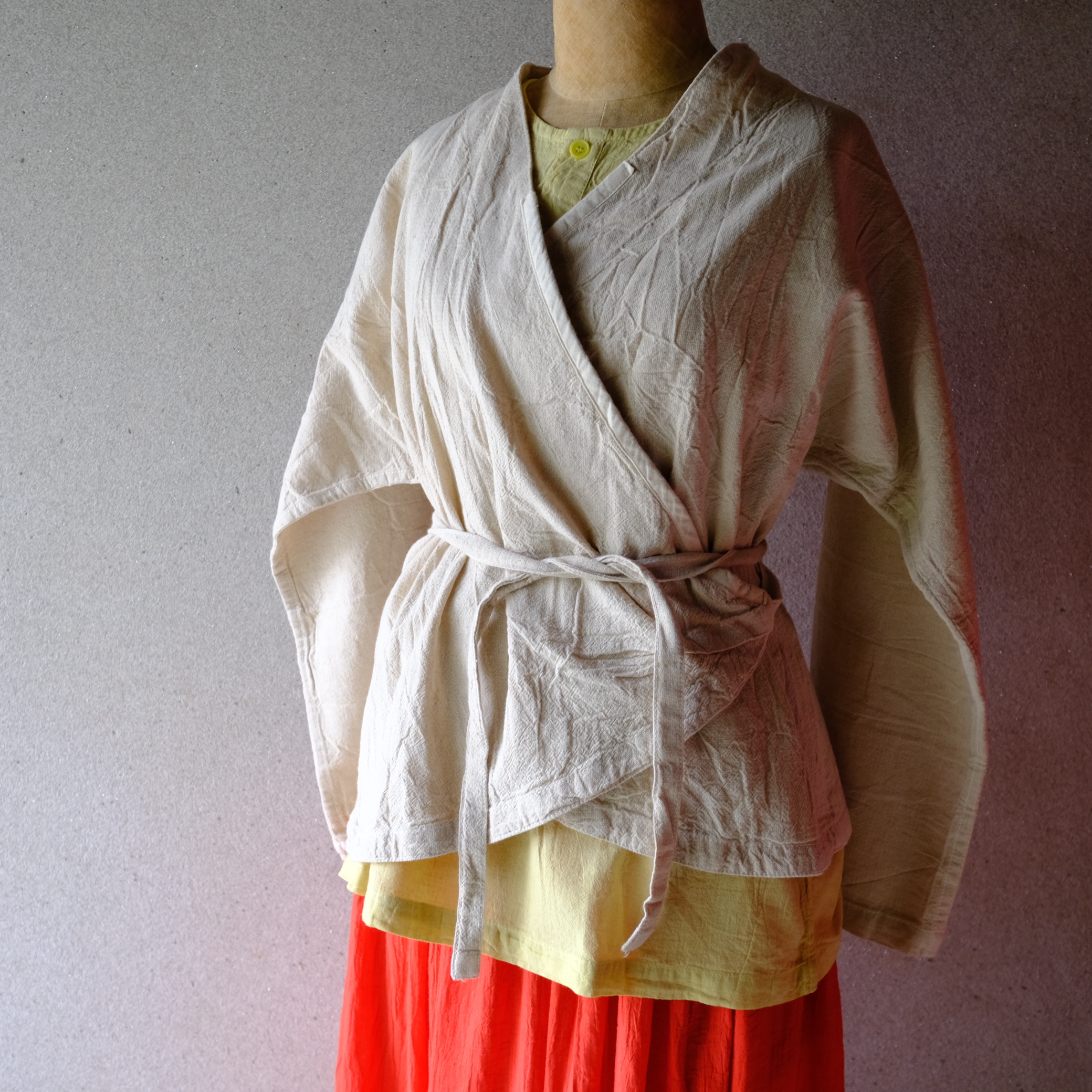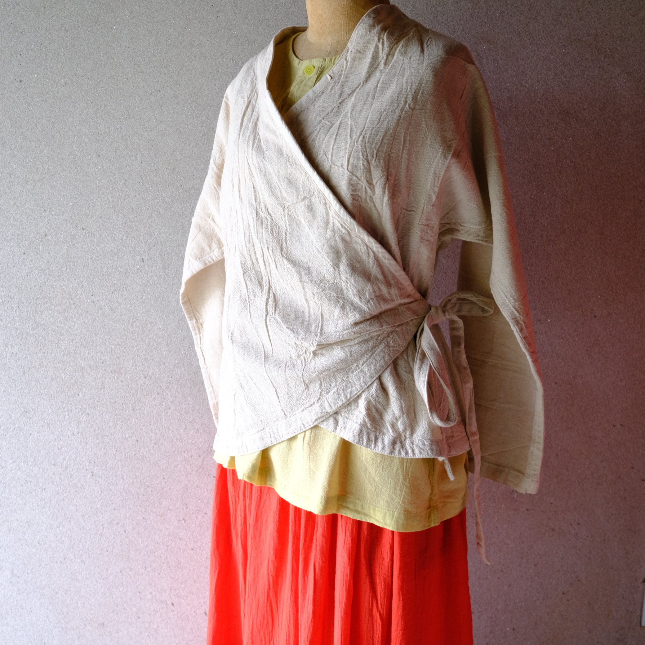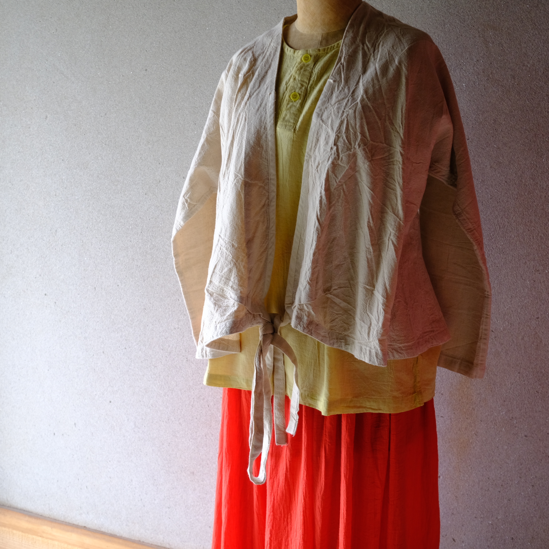 タイトに紐をしばってカットソーのように着たり、あえて紐を垂らしてはおりもののように着たり、いろんな使い方ができます。