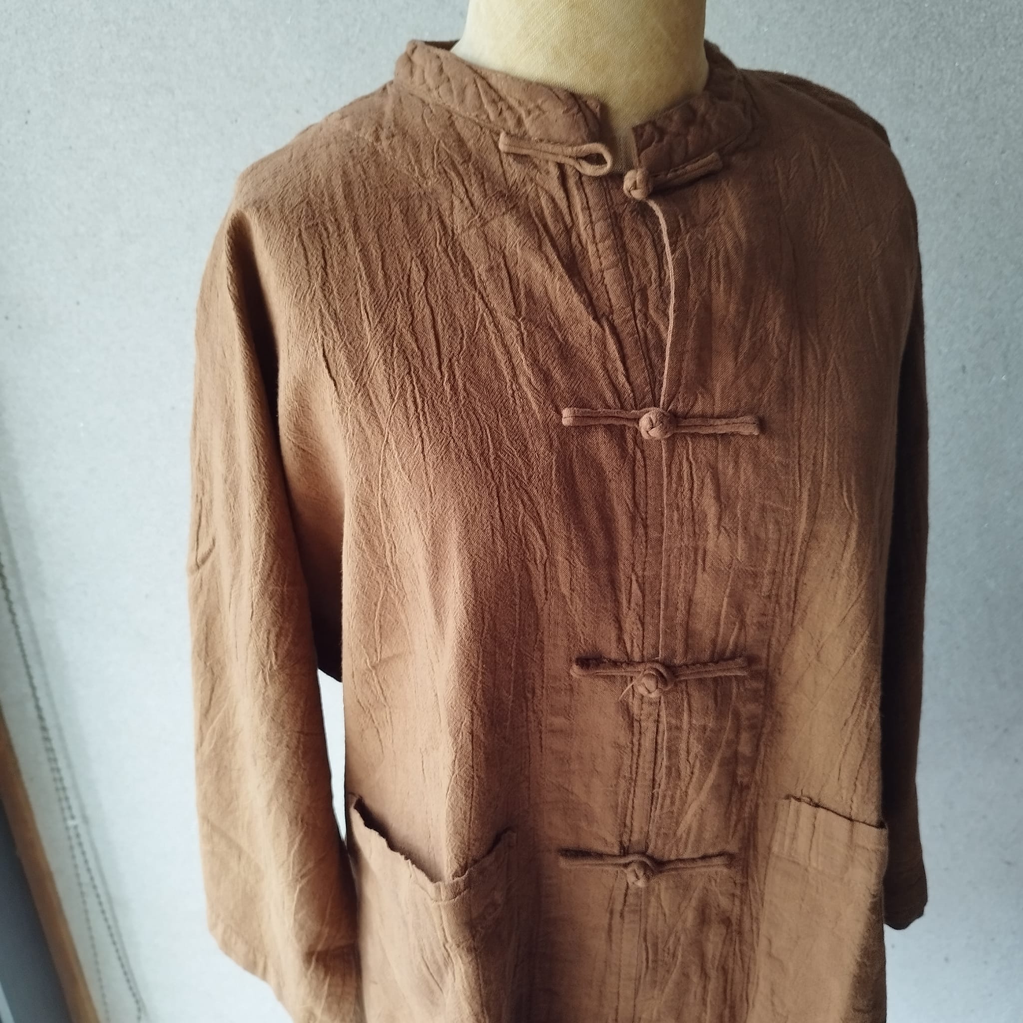 半袖のチャイナシャツです。一枚でカットソーのようにもきていただけますし、前を開けて羽織っても素敵です。小さめSサイズなので女性サイズです。