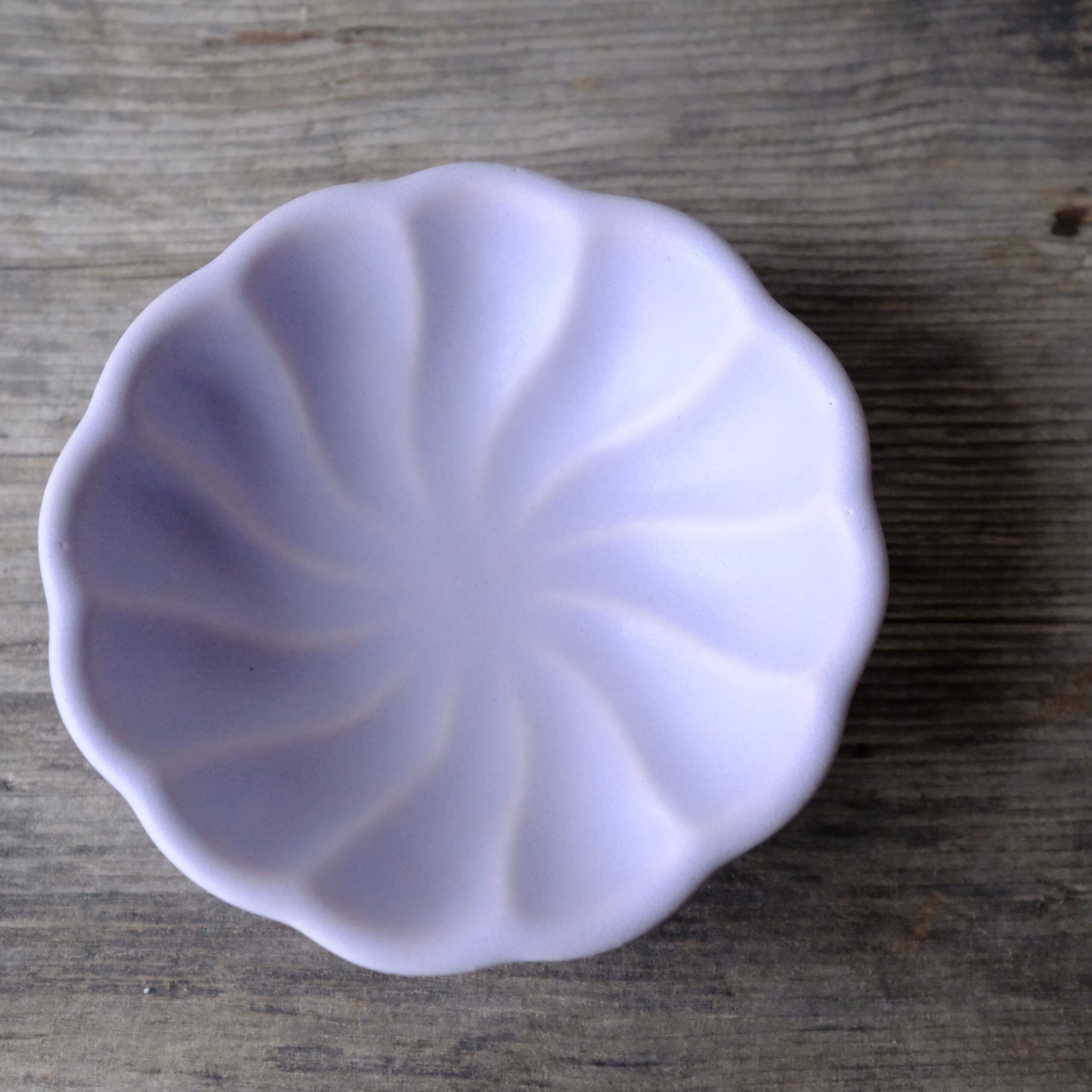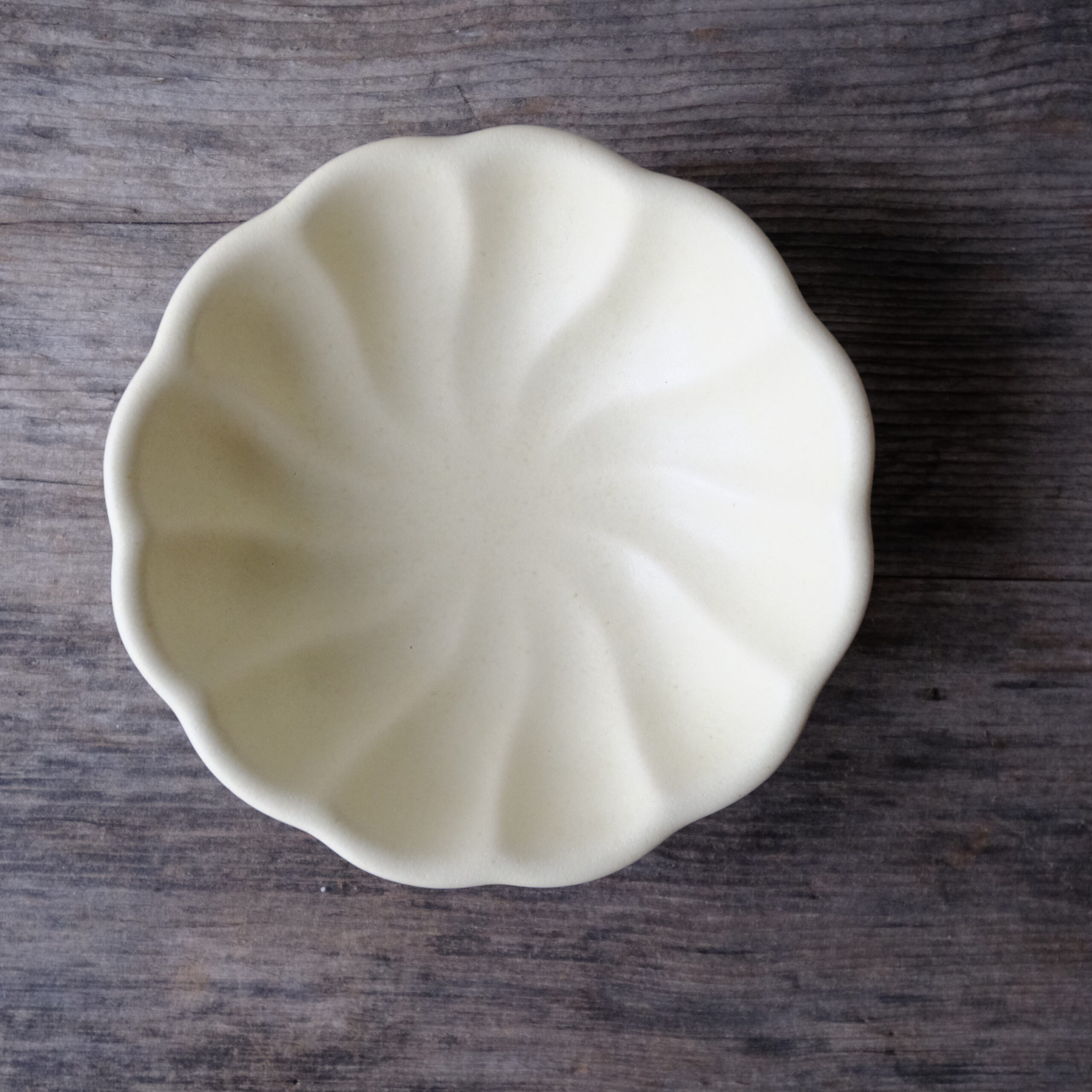 花模様を少しねじったような深みのあるお鉢です。作り置きのおかずを入れたり、ワンプレートに添えたり、ケーキやスイーツも可愛く見えます。ひとつあるだけで急に華やかになる形です。色違いで揃えても可愛いです。